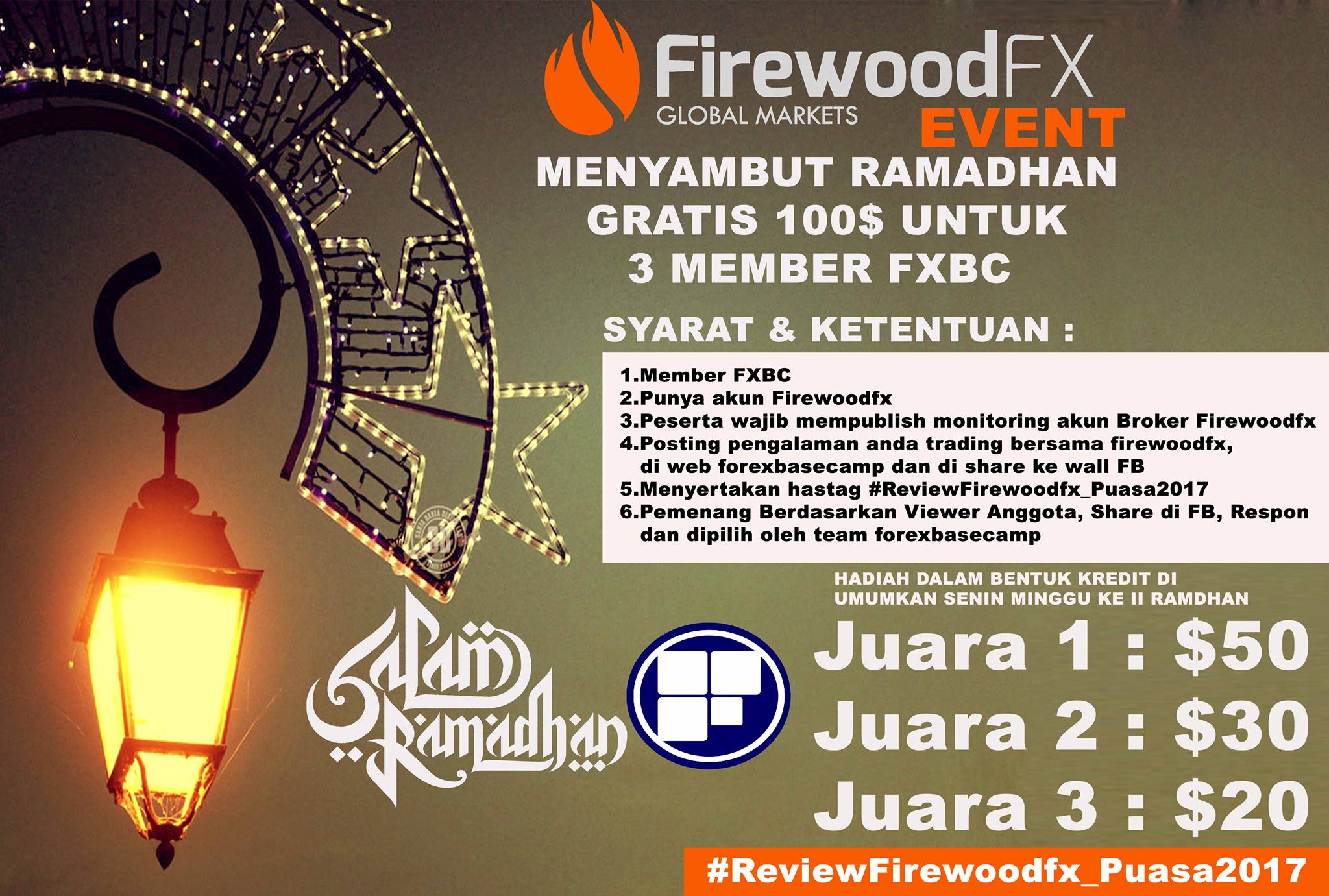 Dalam Rangka Menyambut Ramadhan #Brokerfirewoodfx #firewoodfx menyelenggarakan Event Review untuk member forexbasecamp Hadiah Total 100$ yang dibagikan ke 3 orang yang memberikan review pengalaman trading di Firewoodfx, share monitoring serta membagikan ke Wall FB dan Group lainyan berikut syarat dan ketentuan.
